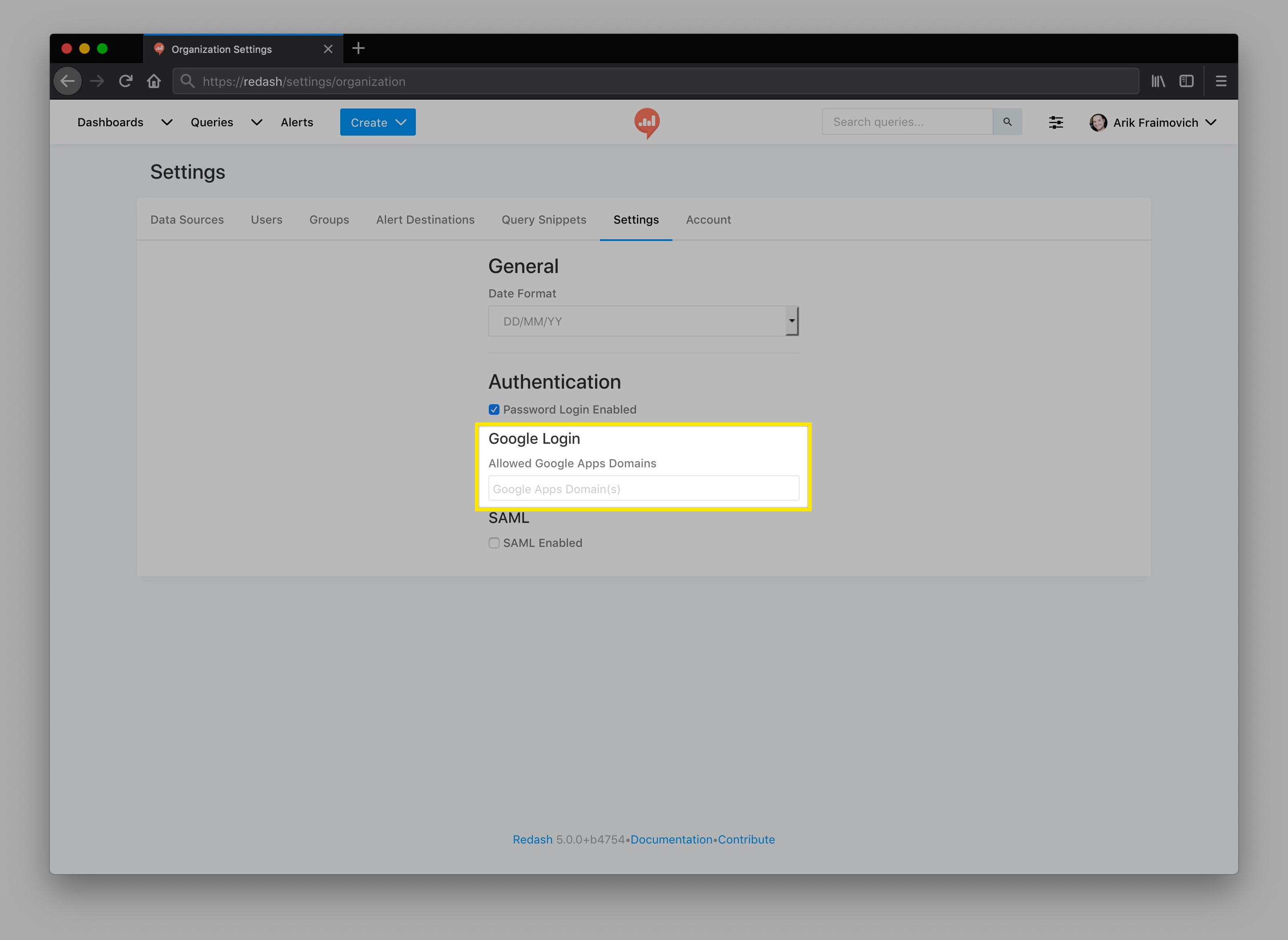 Once updated, restart the web server (docker-compose up -d server). Once enabled, Redash will use Google OAuth to authenticate existing user accounts. To enable automatic user creation who belong to a specific domain name, you can add this domain (or more) in the setting page: