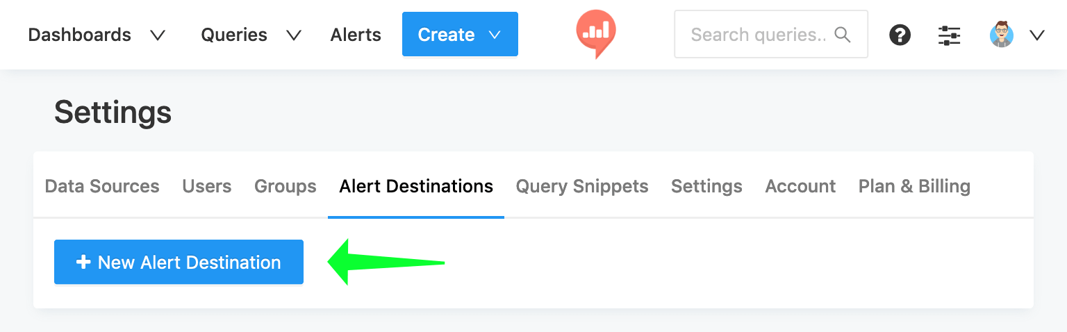 - Open “Alert Destinations” tab in the settings screen, and click on ”+ New Alert Destination”.
