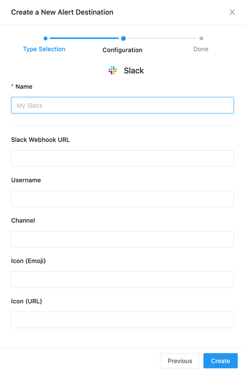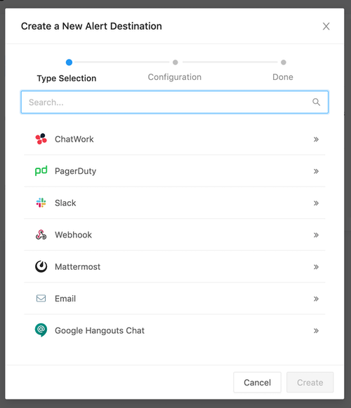 To configure one, select it from Create a New Alert Destination dialogue and follow its prompts.