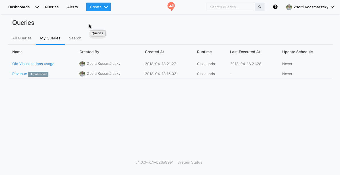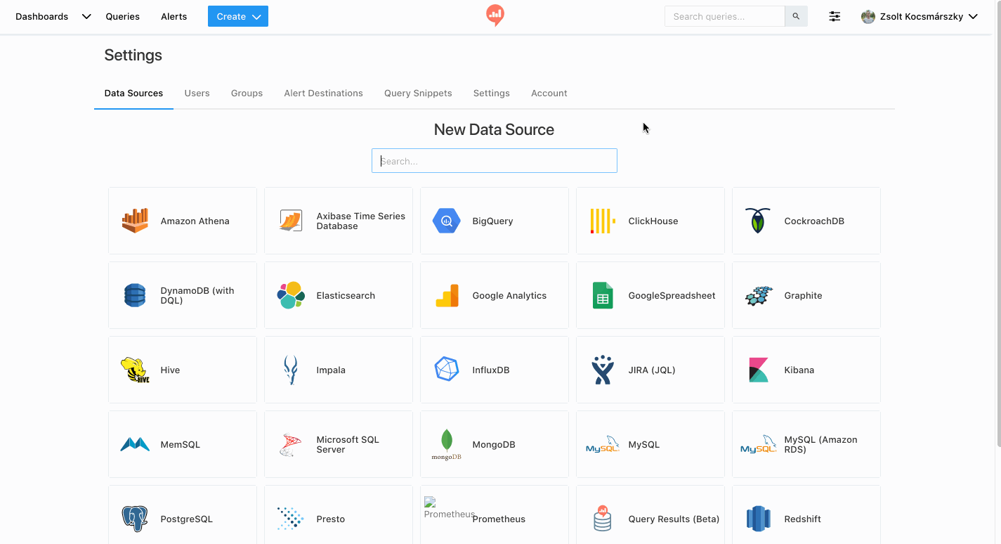 Once you’ve connected a data source, it’s time to write a query: click on “Create” in the navigation bar, and then choose “Query”. See the “Writing Queries” page for detailed instructions on how to write queries.