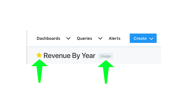 You can favorite a dashboard or query by clicking the star to the left of its title anywhere in Redash. The star will turn yellow to indicate success. Your favorites are displayed at several places in Redash. They appear on the homepage, in the navbar dropdown menus and as filters in the query or dashboard list views.