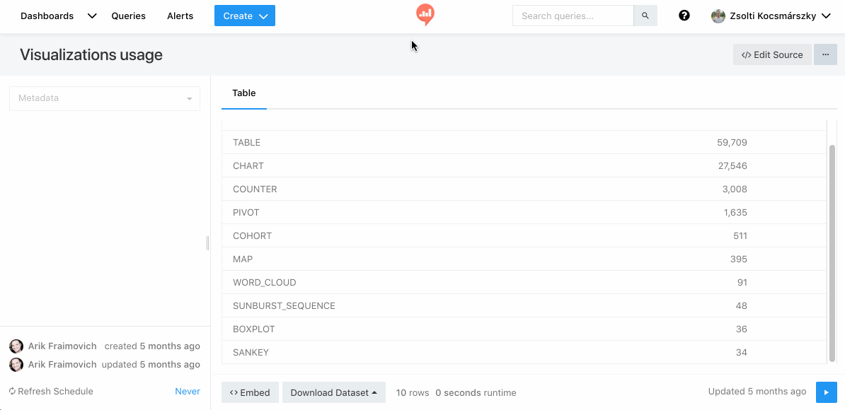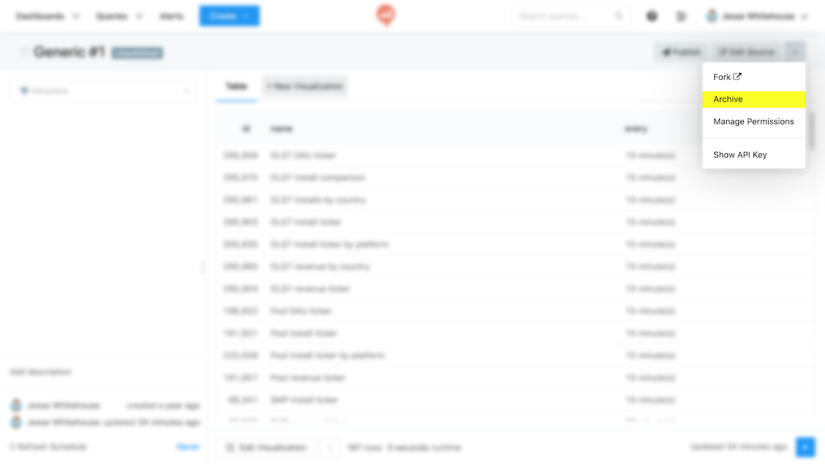 To publish a query, change its name or click the Publish button. You can toggle the published status by clicking the Unpublish button. Unpublishing a query will not remove it from dashboards or alerts. But it will prevent you from adding it to any others.