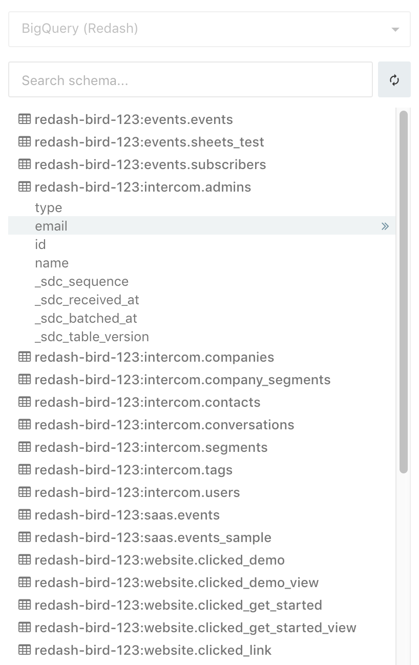 The schema browser will list all your tables, and when clicking on a table will show its columns. To insert an item into your query, simply click the double arrow on the right side. You can filter the schema with the search box and refresh it by clicking on the refresh button (otherwise it refreshes periodically in the background).